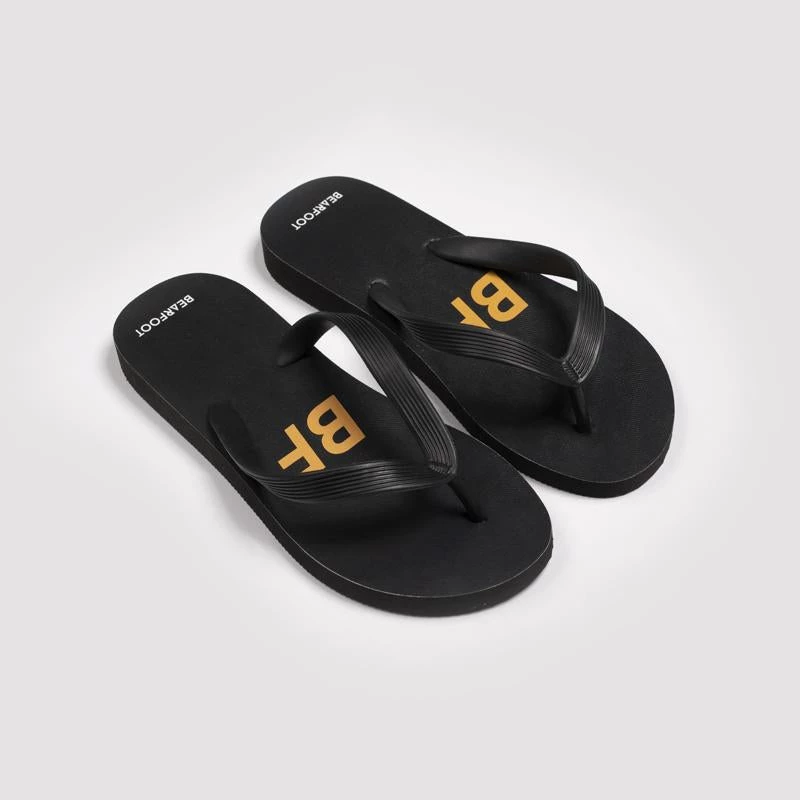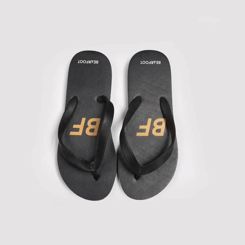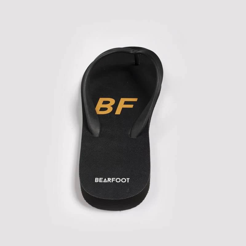 All black flip flops with the orange ‘BF’ logo in the middle of the roof with the ‘Bearfoot’ logo in white on the heel. Â