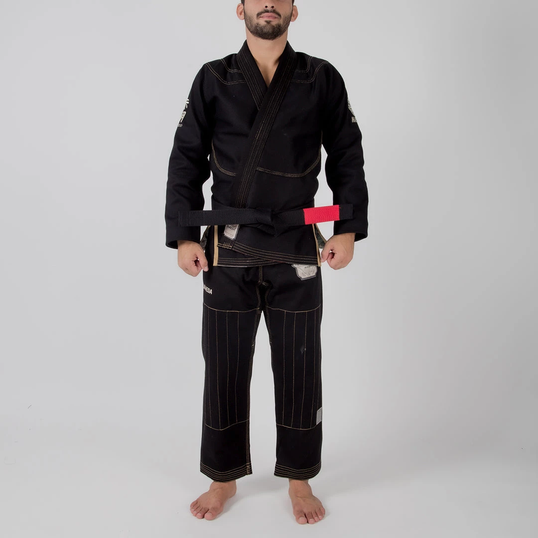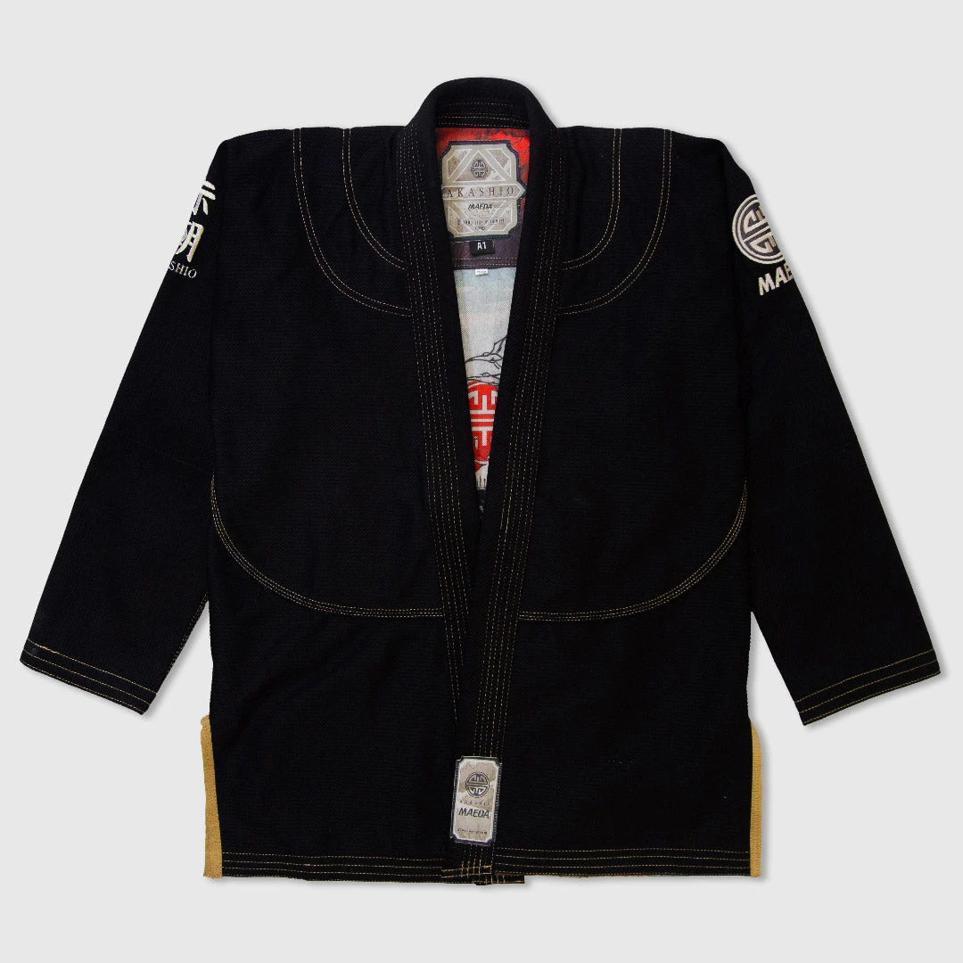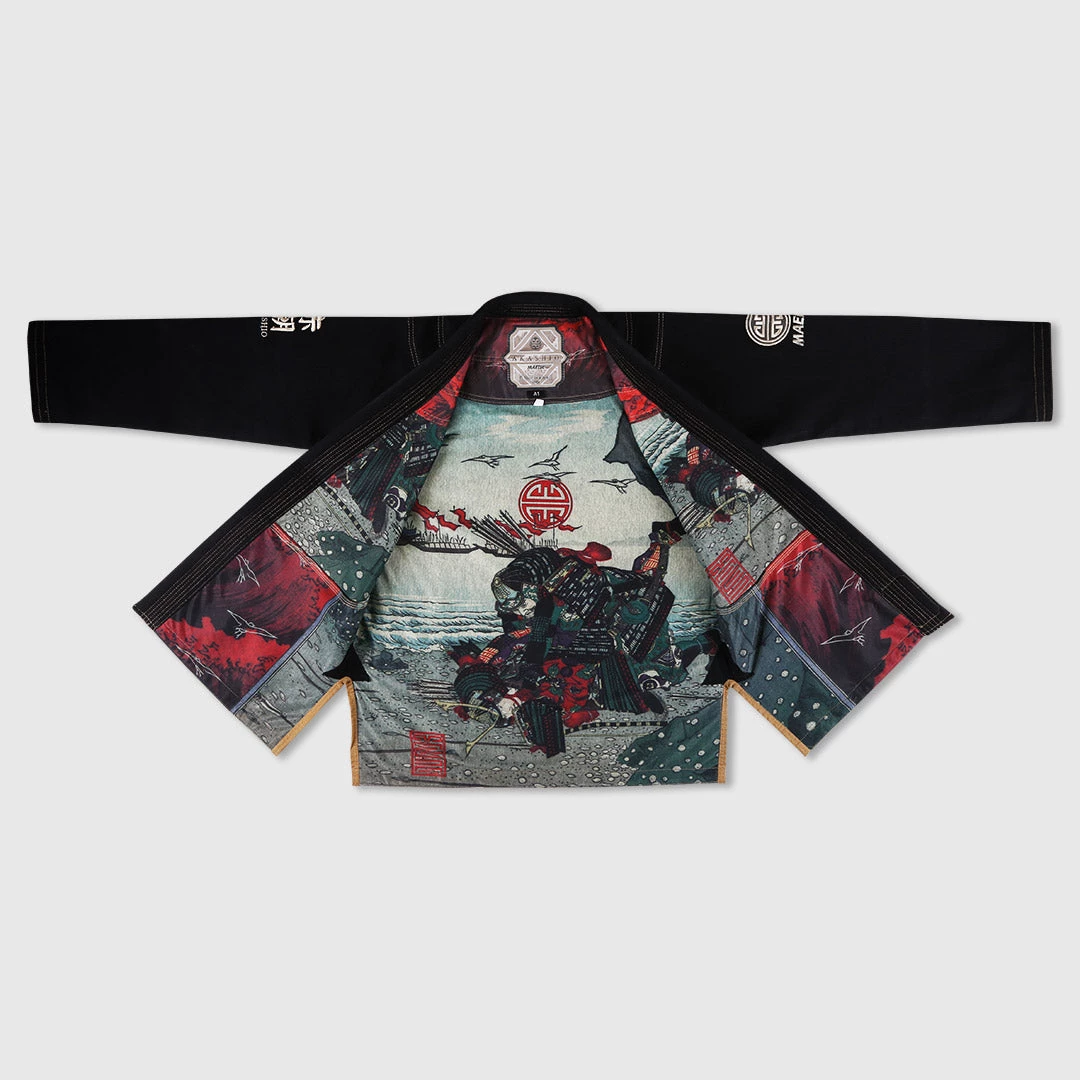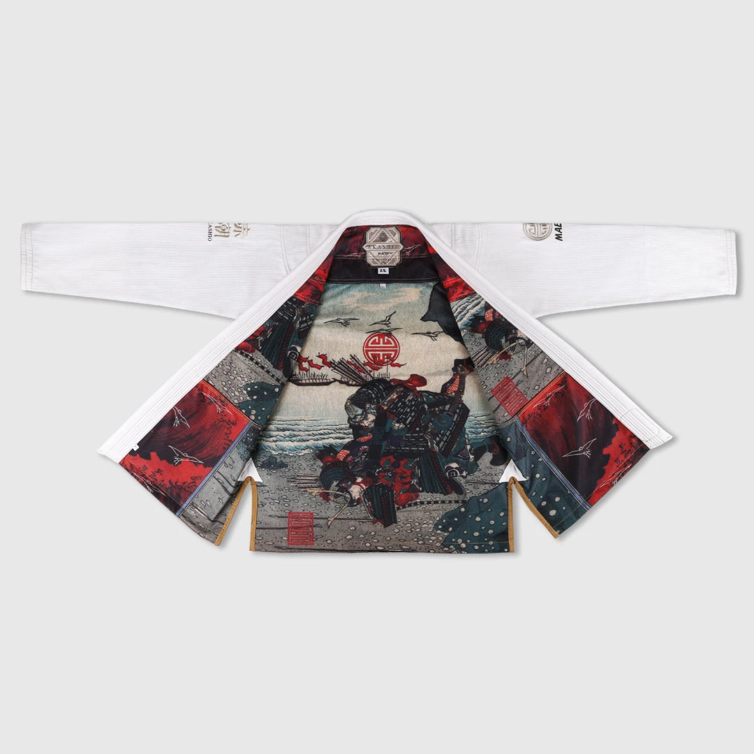 The Akashio Limited Edition Gi features a 480 GSM Pearl Weave Plus jacket and 10 oz drill cotton pants. Gold contrast stitching gives it a high-class look. The inside of the Akashio Jiu-Jitsu gi is lined with a fully sublimated Cool Max fabric, depicting ancient Japanese artwork of a Samurai in the midst of intense battle on the beach, blood staining the ocean red.