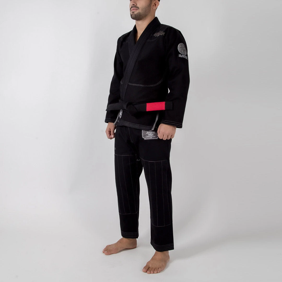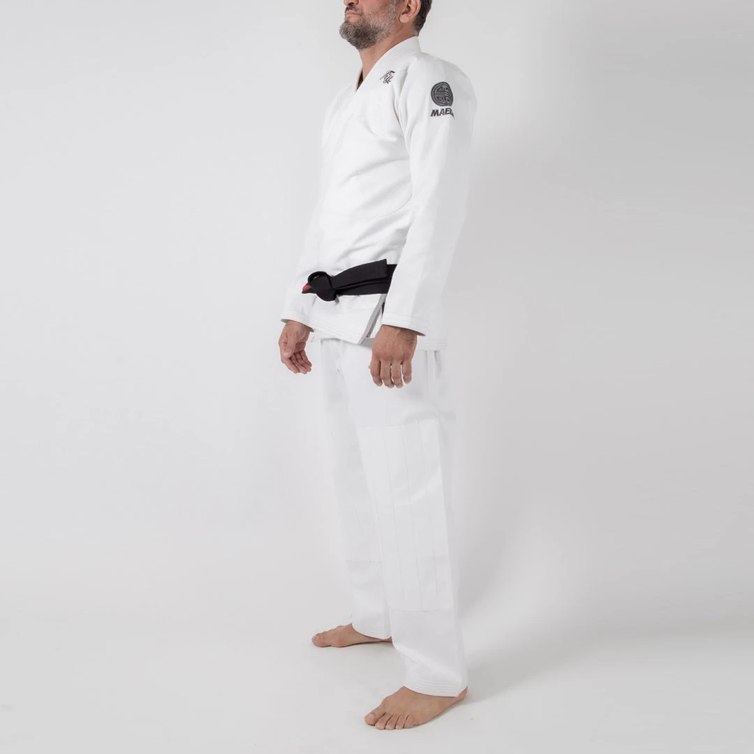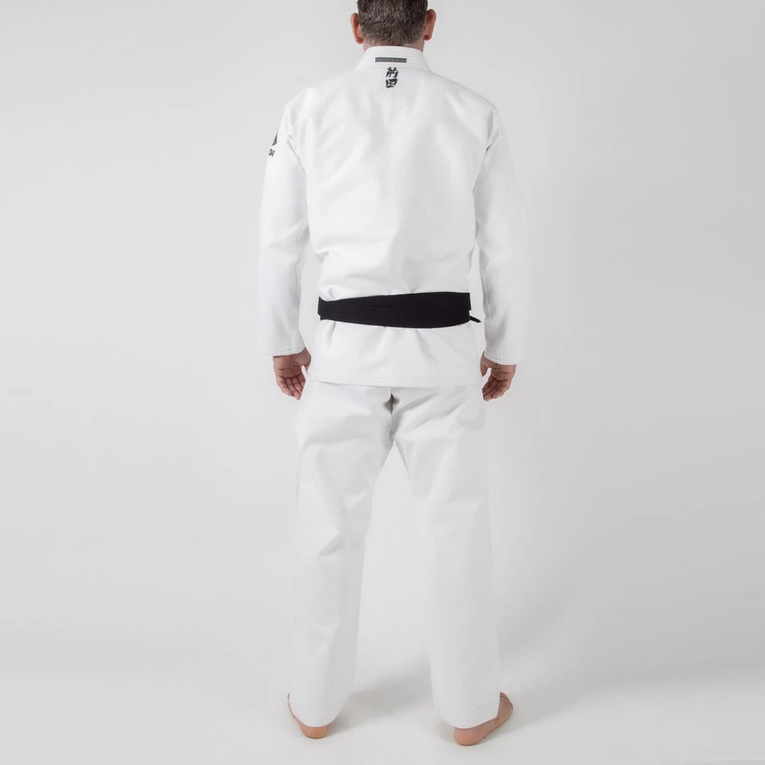 The Fujin (which is the Japanese God of Wind) is an excellent example of Maeda’s dedication to clean, timeless quality, combined with a touch of modern style. Made with an ultra-lightweight 370 GSM Pearl Weave jacket and 8 oz drill cotton pants, the this Maeda jiu jitsu gi is elegantly styled, featuring a silver and forest color scheme, with the Maeda logo embroidered on one shoulder, “Maeda” in Kanji on the other shoulder and back of the jacket, and a stylized “Fujin” across the collar bone. Comes with a matching gi bag.