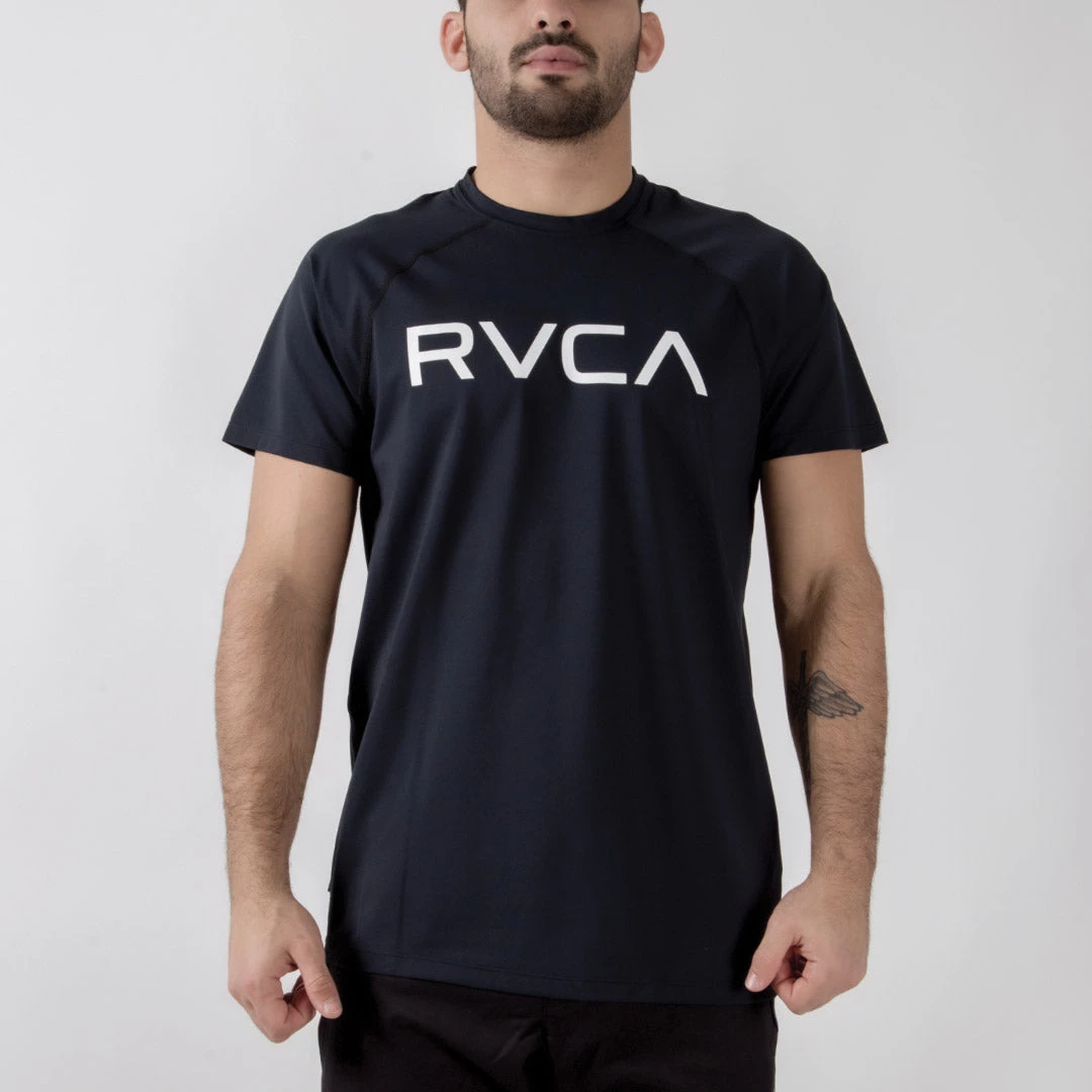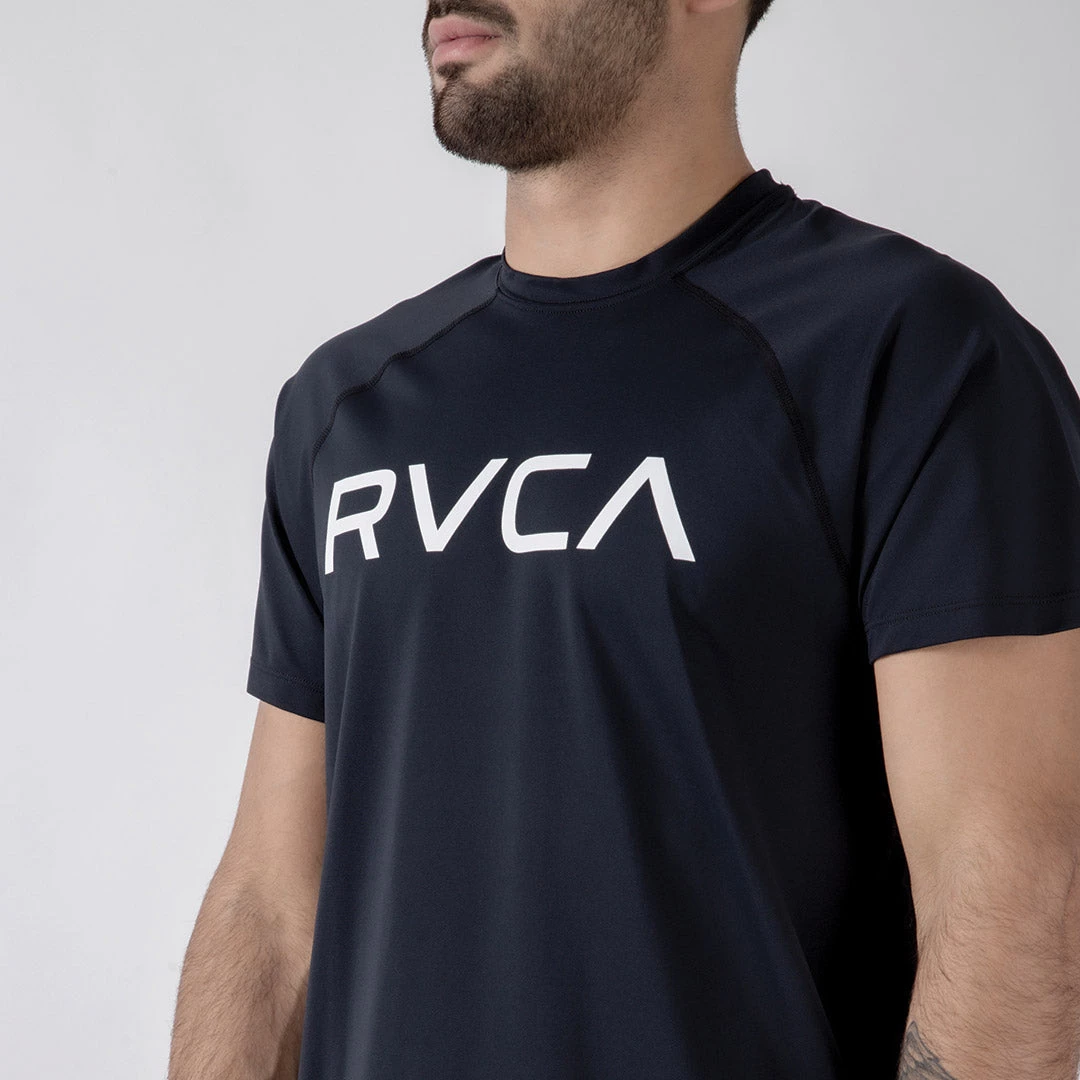 THE RVCA MICRO MESH SHORT SLEEVE SURF TEE DELIVERS A MODERN STANCE ON THE ESSENTIAL RASHGUARD. MADE TO FIT LIKE A T-SHIRT, THE MENS RASHGUARD/PERFORMANCE T-SHIRT HYBRID FEATURES RVCA SCREEN PRINTS, FLATLOCK STITCHING AND VA (UVA AND UVB) PROTECTION.