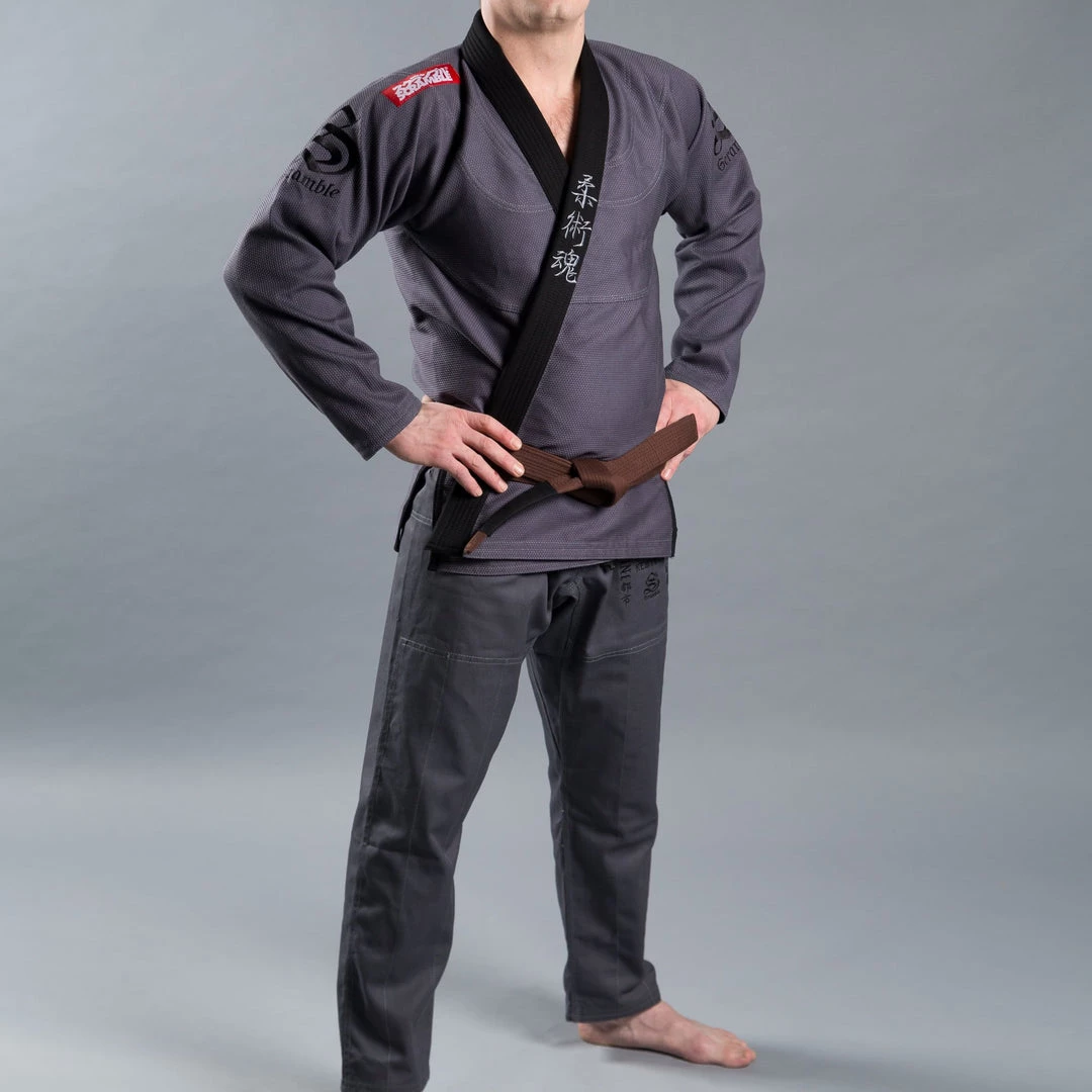Scramble presents a limited edition color of its popular Athlete jiu jitsu gi, the Scramble Toshi Jiu Jitsu Gi, featuring a more traditional cut and design, with a lightweight 450 GSM pearl weave jacket and durable 10oz twill cotton pants, in a sharp charcoal grey with contrasting black lapel and high-quality embroidered details.Â