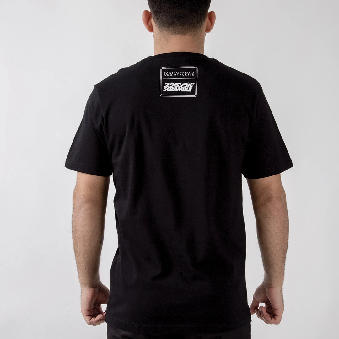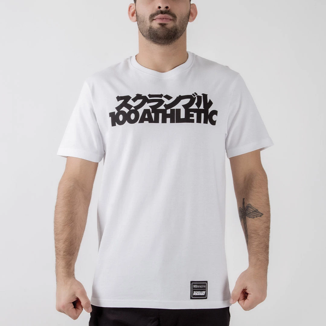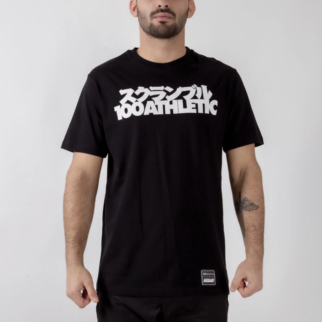 The 100Athletic x Scramble t-shirt features a hybrid logo in the Scramble style.